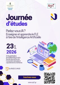 • 23 Απριλίου 2026: Ημερίδα υπό την Αιγίδα του Υπουργείου Παιδείας με τίτλο “Parlez-vous l’IA ? Enseigner et apprendre le FLE à l’ère de l’Intelligence Artificielle”